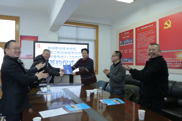 在参观结束后,艺术设计学院院长叶云龙与温州市第二职业中等专业学校副校长蔡克全在前期交流成果基础上,就今后的合作办学方式进行了详细的探讨与交流,双方达成了2018级摄影摄像技术专业“3+2”合作办学项目,并签订了中高职合作办学协议书。