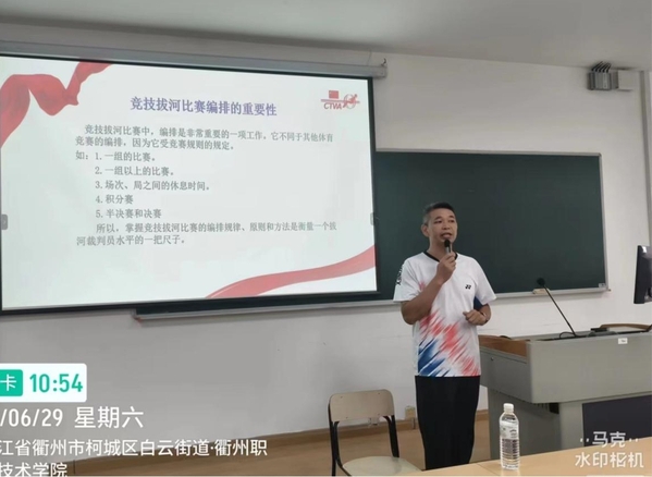 为进一步加强衢州市拔河裁判员队伍建设,培养全市具有发展潜力的中青年裁判骨干,提高裁判员业务水平,2024年6月27日至29日,衢州市体育局、衢州市拔河协会在我校举办了衢州市晋升拔河二级、三级裁判员培训班。