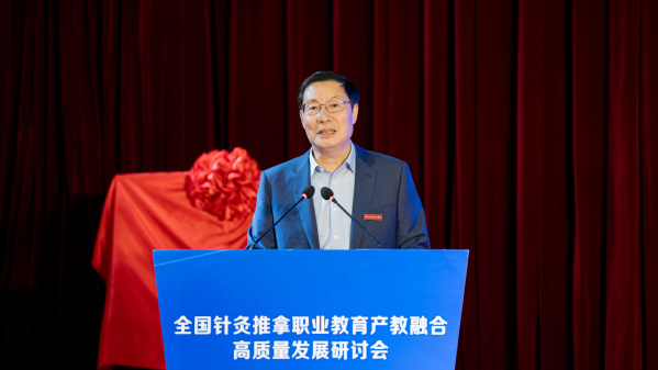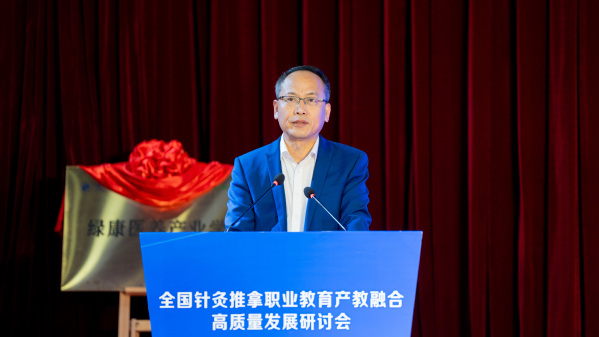 理事长单位代表、我校党委书记徐须实作表态发言。他表示,学校将把高质量建设全国针灸推拿职业教育产教融合共同体作为重大项目加以推进,主动扛起理事长单位职责使命,和共同体成员单位齐心协力,全力以赴办好针灸推拿、中医学等专业,积极探索产教融合创新模式,强化教学团队能力建设,全力培养高素质中医针灸复合型技术技能人才,助力中医康养产业的高质量发展。