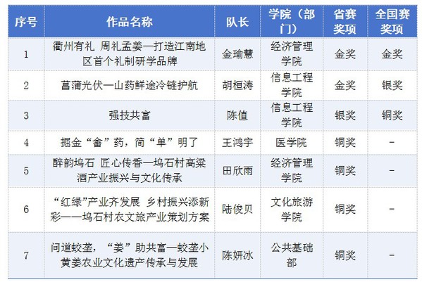 近日,“建行裕农通杯”第七届浙江省大学生乡村振兴创意大赛主体赛决赛在浙江同济科技职业学院落下帷幕。同时,入围省赛项目参加“创青春”第四届全国大学生乡村振兴大赛主体赛决赛评审。我校学子经过初赛、复赛和决赛的激烈角逐,荣获省赛2金1银4铜、全国赛1金1银1铜的优异成绩。