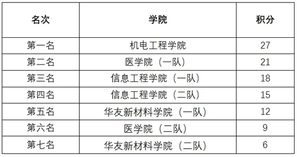 经过激烈角逐,在阵阵加油声中,机电工程学院凭借出色表现夺得冠军,医学院和信息工程学院分别获得第二、三名。具体排名及积分情况如下: