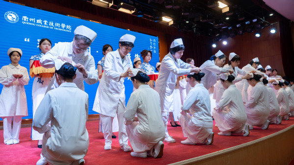 在悠扬而庄重的音乐声中,“冠成今日・爱佑终生 —— 护士加冕礼”温情上演。24级护理专业学生依次上台。护理前辈们亲手为她们戴上象征圣洁与使命的燕尾帽,传递承载希望的烛火。在领誓人刘瑞芳的带领下,新一批护生庄严宣誓,铿锵有力的誓言回荡在现场,字字句句饱含着对护理事业的忠诚与热爱。这一刻,她们正式接过守护生命的接力棒,将以坚定的信念和无私的奉献,踏上神圣的护理征程。