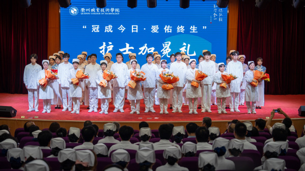 5月8日晚,医学院在图书馆一号报告厅隆重举行庆祝“5.12”国际护士节暨第二十一届健康周开幕式。党委书记徐须实,党委副书记何百通,党委委员、纪委书记方焕云,党委委员、宣传部部长孔庆红,党委委员、组织部部长周帅出席,特别邀请四省边际中心医院护理部主任朱慧芬、副主任叶玲荣、护理助产实习总带教徐文仙,衢州市中医医院护理部主任蒋俊燕,衢州市第二人民医院护理部主任许桂芬、科教科科长叶志仙为护生授帽,相关部门负责人,医学院领导班子、辅导员、班主任和全体护生参加。