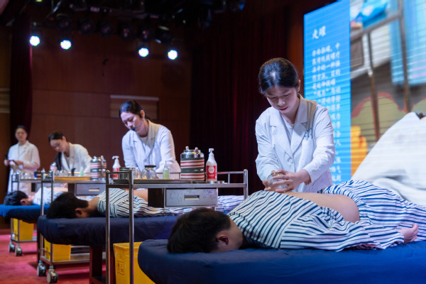 活动在针灸推拿专业学生团队带来的《针推灵动秀·健康青春力》拔罐技能展示中拉开帷幕。同学们以专业精准的理疗手法、亲切温和的人文关怀,逐一展示了闪罐、滚罐和走罐操作,彰显了传统中医的博大精深和无穷魅力。